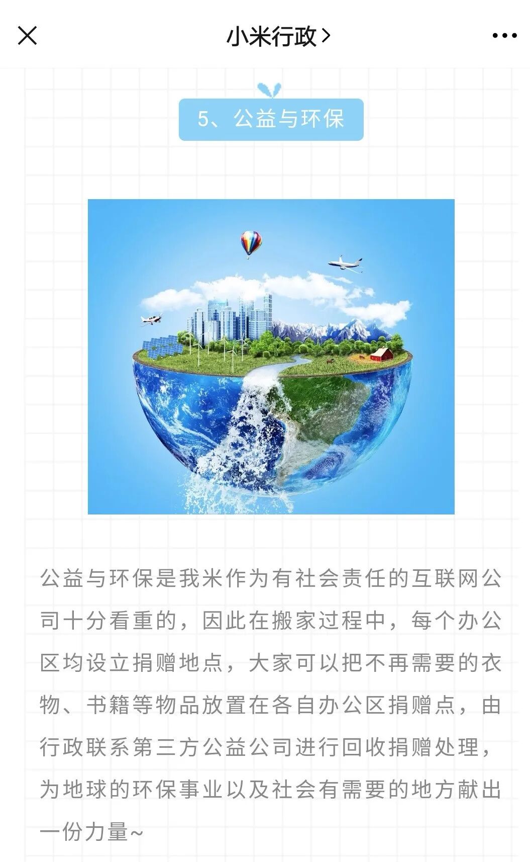 小米搬迁时,提倡大家“断舍离”,并设立捐赠点,号召大家捐赠闲置物品,为环保事业和公益活动献出自己的一份力量。