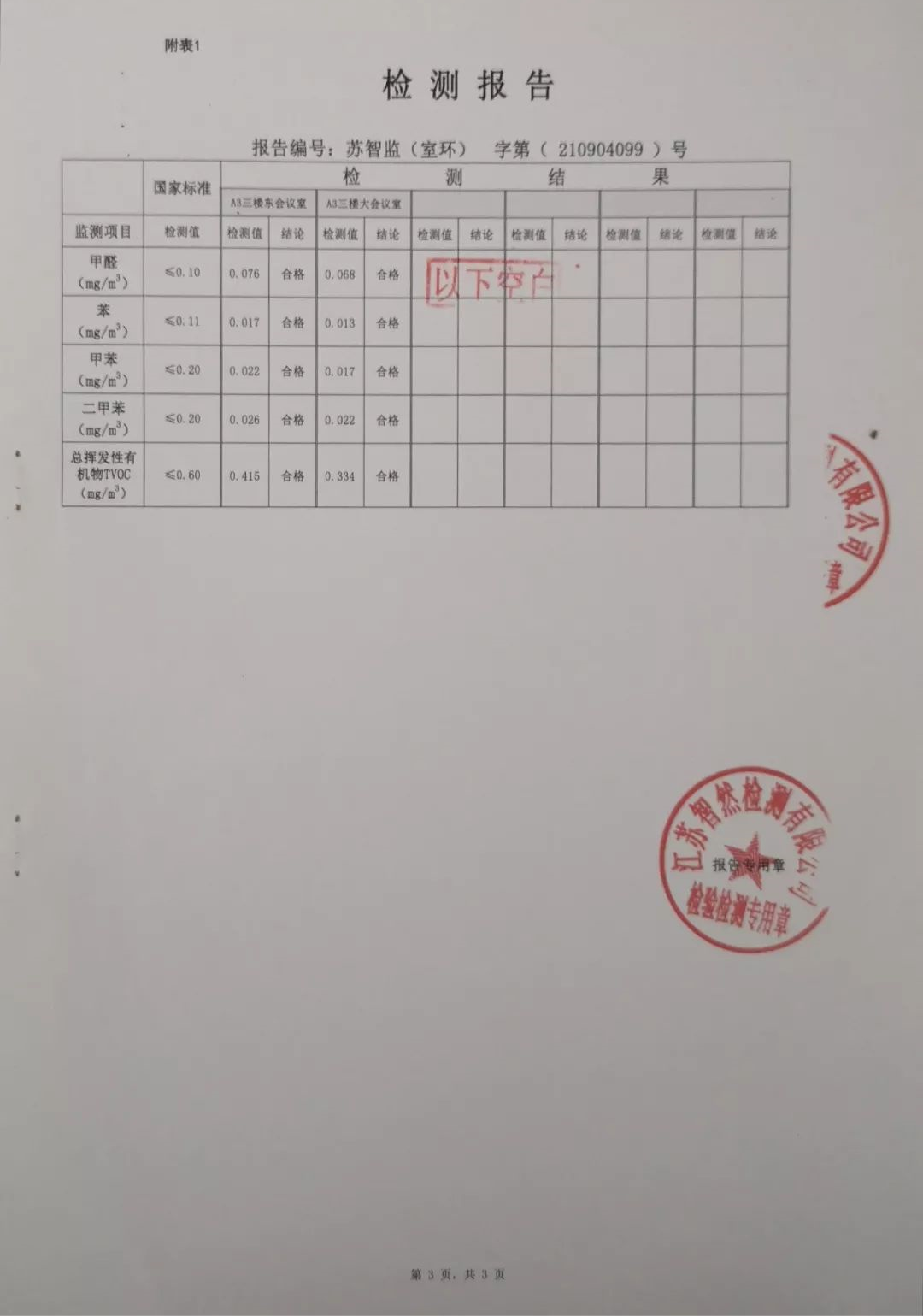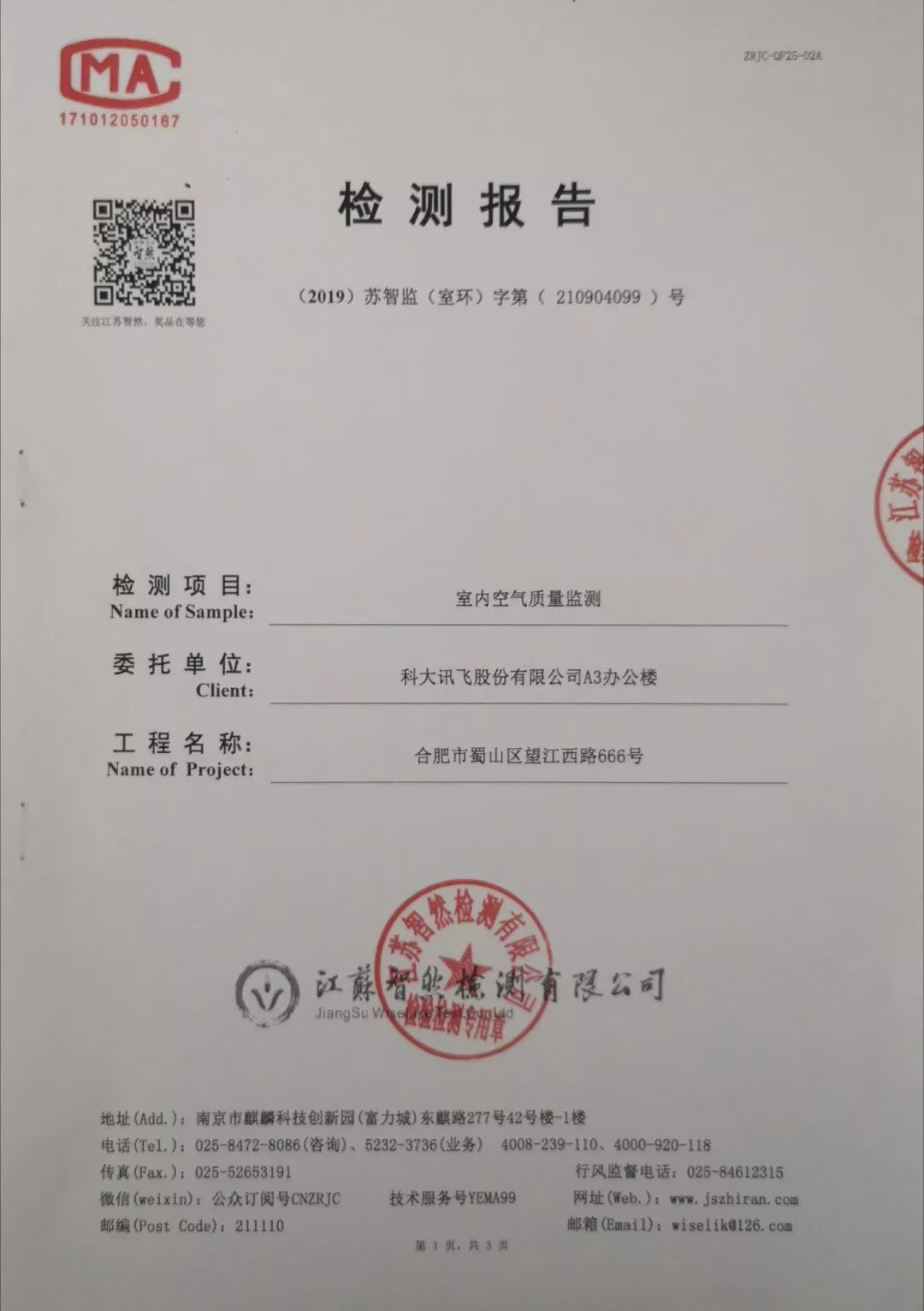 科大讯飞向员工展示了新址甲醛处理的全过程,并附上了空气质量监测报告,证明室内空气质量已达标。