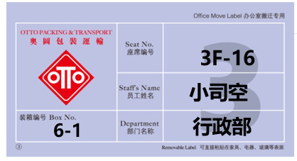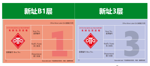 司空公司搬迁时使用的标签,除了以上这些信息外,还通过颜色作为楼层的区分,例如“橘色”为B1层,“蓝色”为3层。