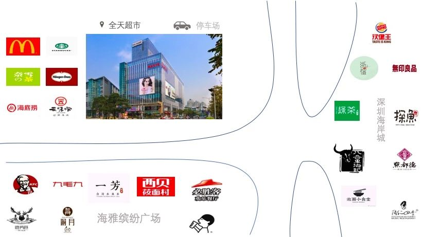 第四范式·深圳将周边商业圈通过简单的平面图展示,重点标注各类餐饮设施。