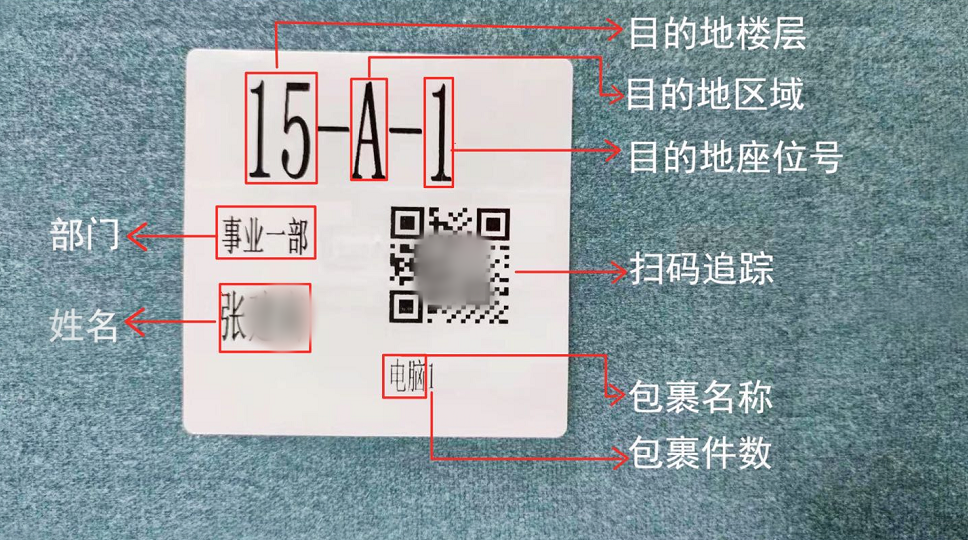 信息标签内容一般包括:姓名、部门、目的地工位信息、整理箱编号等。