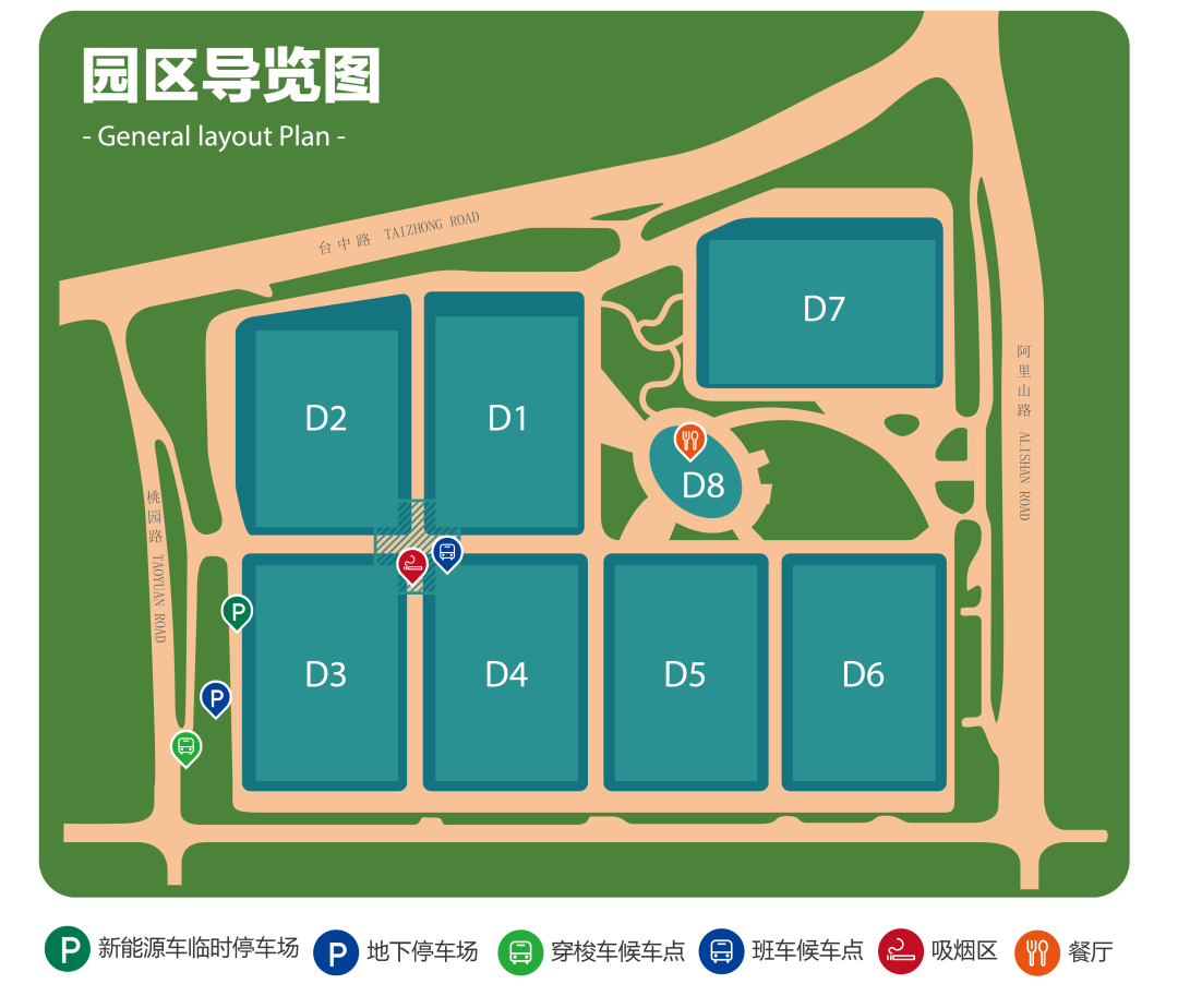 华为·东莞用一张平面图,将园区里的设施都标注清楚,还特别标明了吸烟区。