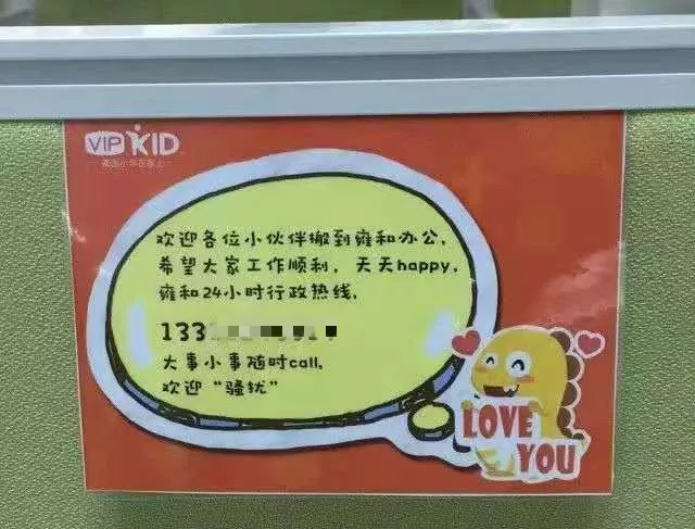 VIPKID在员工的桌上都贴有行政服务热线,24小时帮助员工解决问题。