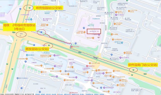 2.公交:软件园南门站(公交站),线路:18路、39路、68路、94路、123路、127路、751路、M38路、M3路、M7路;下车步行方式:从软件园南门站下车,向正西方向出发,沿吕岭路走290米,右转30米左右到达;岭兜佳园站(公交站),线路:18路、73路、102路、105路、129路、317高峰快线、653路,656路、751路、754路、M3路;下车步行方式:从岭兜佳园站下车,向正南方向出发,沿金山路走60米,左转走250米,左转走10米到达。明发园站(公交站),线路:18路、39路、68路、94路、123路、127路、656路、751路、M38路、M7路;下车步行方式:从明发园站下车,向正东方向出发,沿吕岭路走230米,左转(红绿灯处过马路)进入岭兜西路走20米,左转走130米,右转走10米到达。