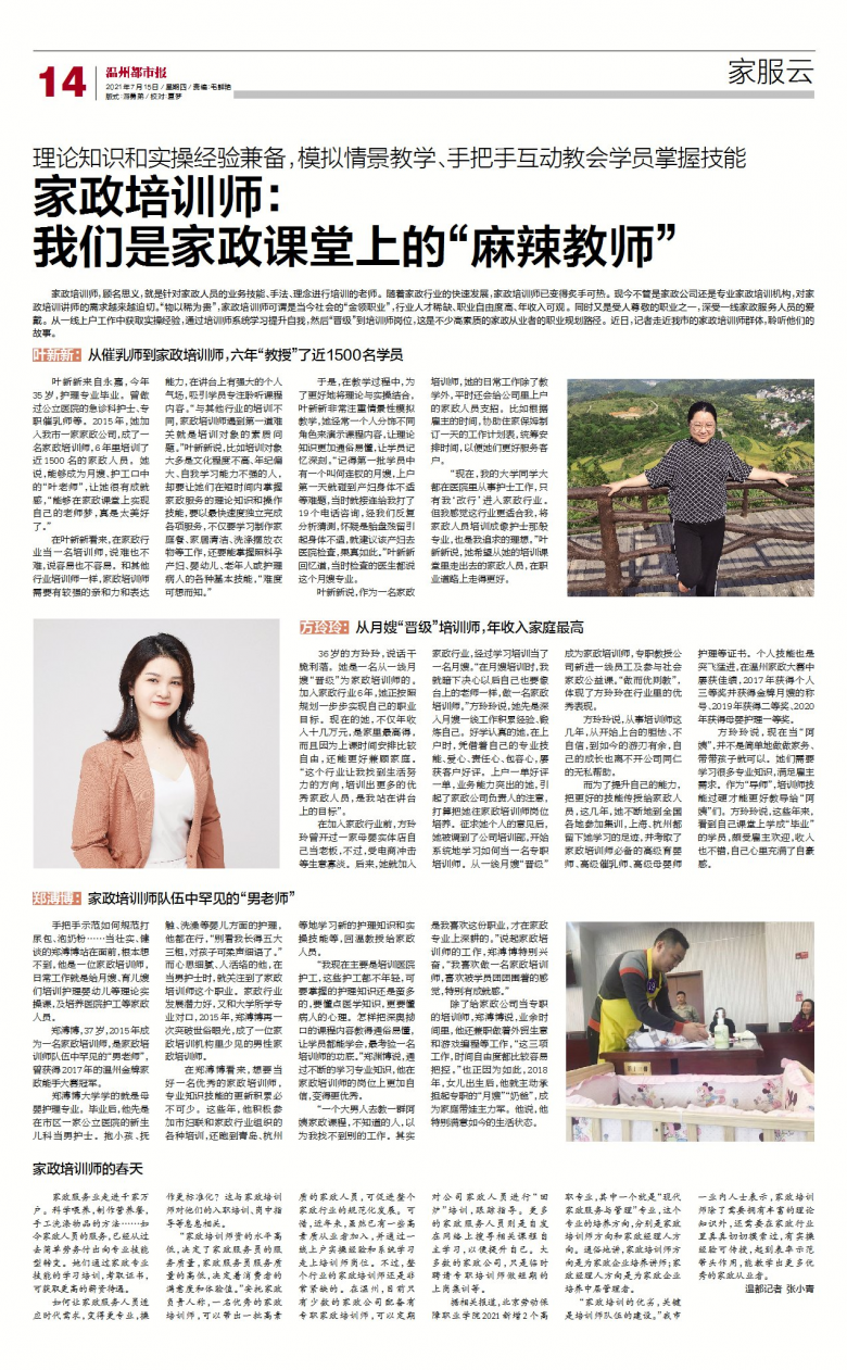 叶新新来自永嘉,今年35岁,护理专业毕业。曾做过公立医院的急诊科护士、专职催乳师等。2015年,她加入我市一家家政公司,成了一名家政培训师,6年里培训了近1500名的家政人员。她说,能够成为月嫂、护工口中的“叶老师”,让她很有成就感,“能够在家政课堂上实现自己的老师梦,真是太美好了。”